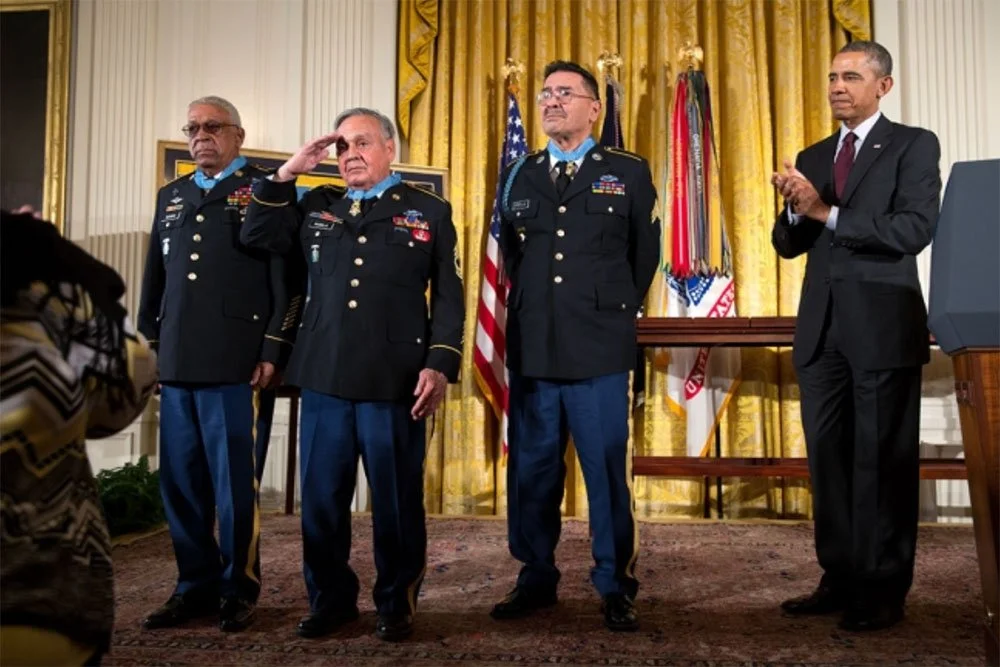 President Obama and Medal of Honor Recipients from left, Staff Sergeant Melvin Morris, Sergeant First Class Jose Rodela, and Specialist Four Santiago J. Erevia,